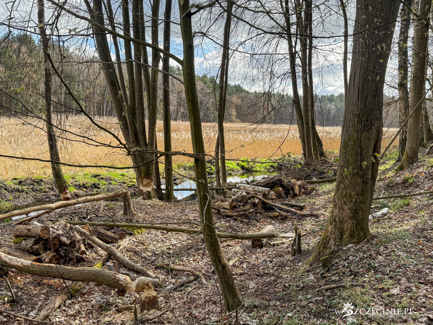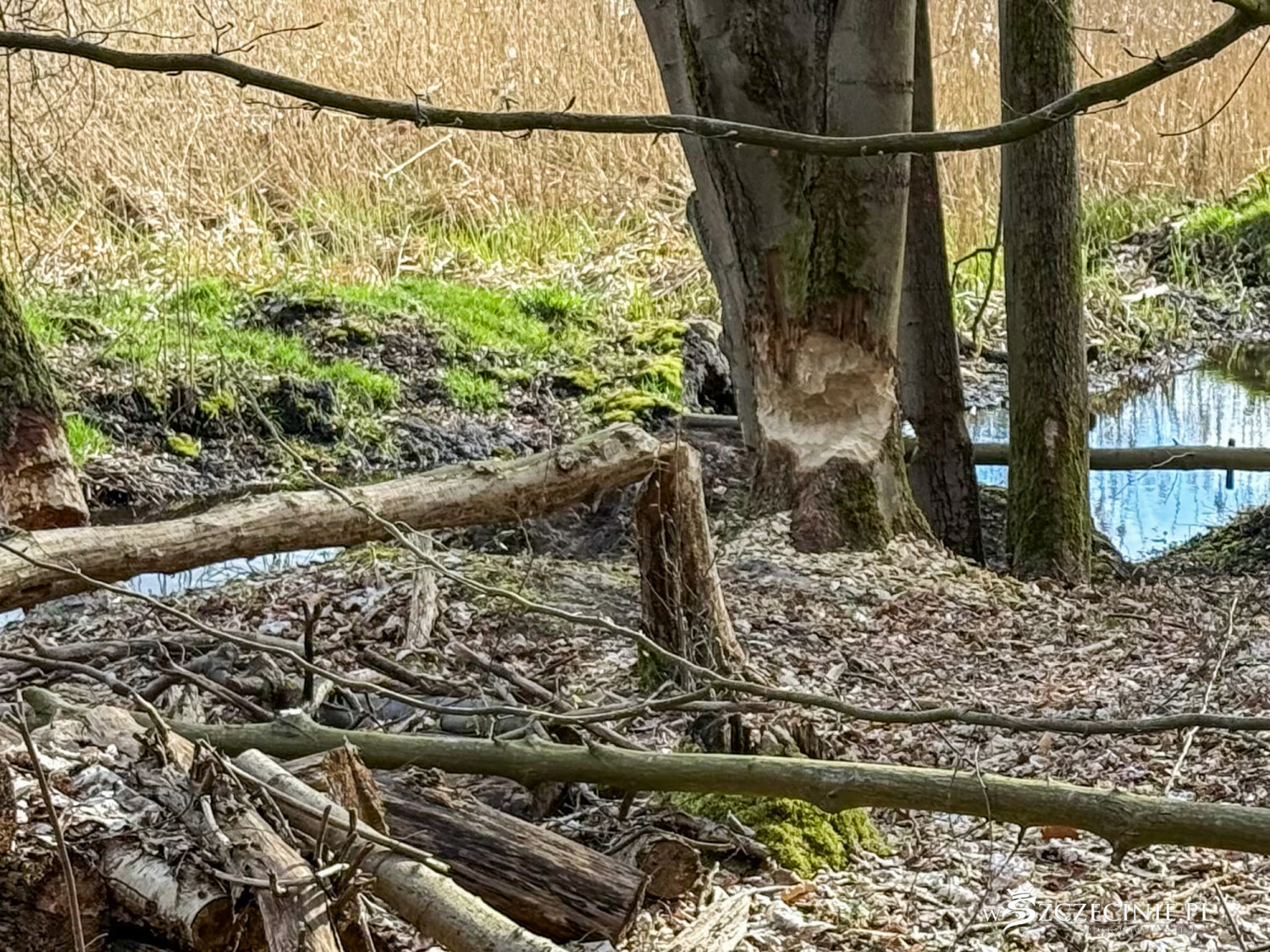 – Został prawdopodobnie odtworzony, aby wyregulować strugę. Kiedyś były tutaj hodowle ryb, dziś są bobry. Widać, jak sobie tutaj działają – opowiada Wiktor Możdżer, wskazując na poprzegryzane drzewa. – Gdzieś w tych groblach mają żeremie i tam sobie siedzą. Długo ich u nas nie było, ale prawdopodobnie powróciły z powodu tej regulacji.