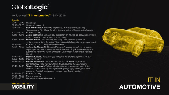 W tym roku tematem przewodnim spotkania będzie „The Future of Mobility”. Wśród prelegentów znajdą się uznani eksperci z dziedziny motoryzacji, będą to: Joerg Tischler reprezentujący firmę T-Systems; dziennikarz motoryzacyjny Piotr R. Frankowski; Aleksander Rzepecki – Vehicles Implementation Manager, Mercedes-Benz Electric; Michael Niklas – Head of Software Standards w firmie Continental; Ivan Kondratenko, Consulting Analyst, Mobility Practice, Frost & Sullivan; Mariusz Kulczyk, Project Manager, GlobalLogic S.A.; Tomasz Klekowski, ekspert w dziedzinie transformacji cyfrowej i ewangelista technologiczny, członek zarządu Polskiej Konfederacji Lewiatan i Związku Pracodawców Technologii Cyfrowych Lewiatan oraz prowadzący konferencję Rafał Motriuk, korespondent naukowy Polskiego Radia. Specjalnymi gośćmi “IT in Automotive” będzie PWR Racing Team biorący udział w studenckich wyścigach Formuły 1, który przedstawi swój samochód wyścigowy RT-09. Przy współpracy z GlobalLogic PWR Racing Team stworzył i ulepszył komponenty oprogramowania w obecnie wykorzystywanym samochodzie. Zespół nieustannie rozwija oprogramowanie, które zostanie zaimplementowane w ich bolidzie wyścigowym w przyszłości. S.A.
