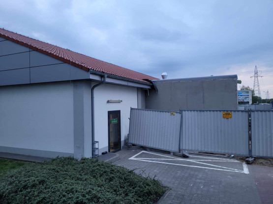 Sklep nadal jest czynny, ale część parkingu zajęły ekipy budowlane. Dobudówka wyraźnie odznacza się na tle dotychczasowej bryły marketu.