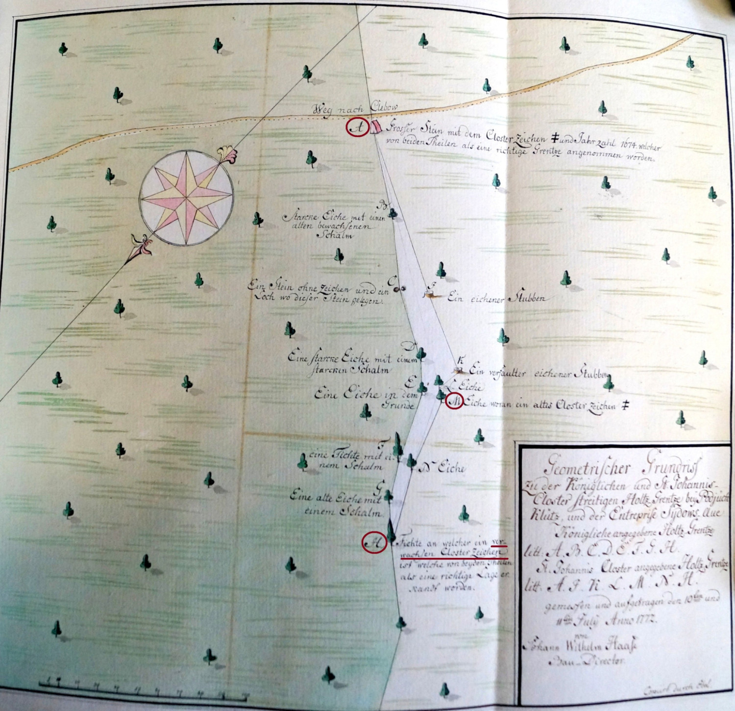 Szkic ustalał w pobliżu Podjuch, Klucza i Żydowiec „granicę drzewną” pomiędzy ziemiami należącymi do królewskiej kamery państwowej a włościami Fundacji im. Klasztoru św. Jana w Szczecinie. Zaznaczone są na nim istniejące wówczas punkty graniczne, w tym dwa kamienie, jeden z krzyżem opisanym jako „znak klasztorny” i rokiem 1674.