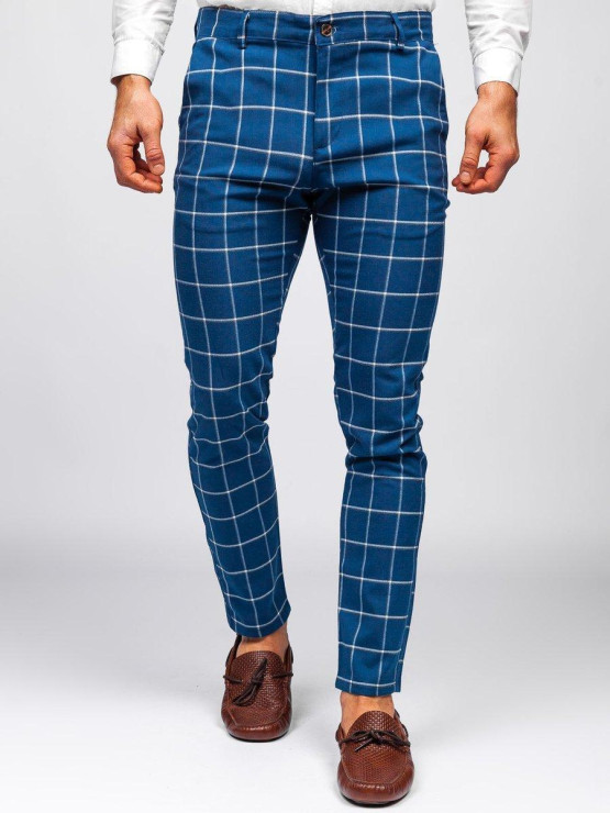 Niebieskie chinosy w kratkę dla fanów ekstrawagancji
