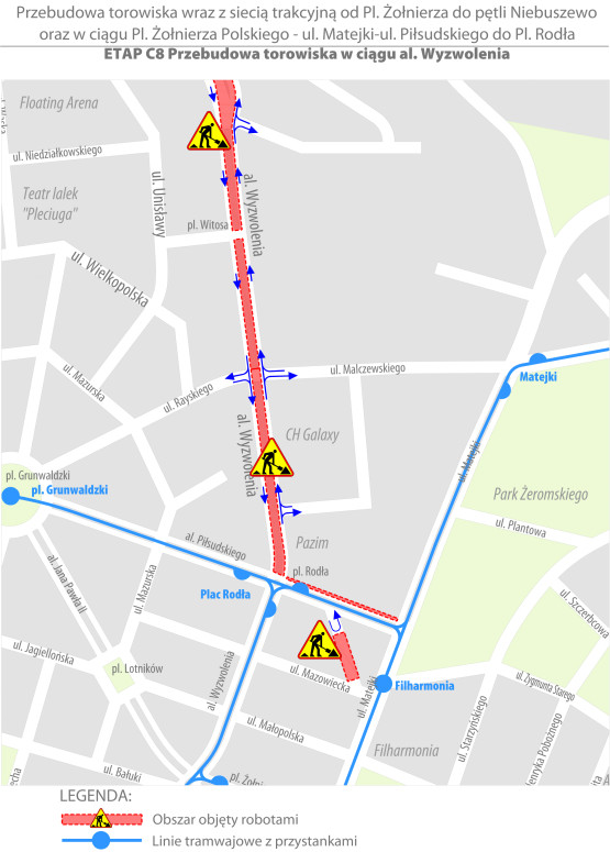 – zamknięty zostanie przejazd przez torowisko na skrzyżowaniu Wyzwolenia – Rayskiego – Malczewskiego oraz wyłączona zostanie na tym skrzyżowaniu sygnalizacja świetlna;