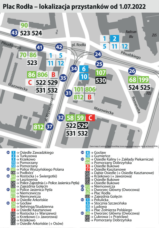 12. Autobusy linii 522 i 532 między przystankami „Brama Portowa” i „Rayskiego” w obu kierunkach kursować będą stałą trasą przez pl. Rodła. Likwidacji ulegnie przystanek „Filharmonia” (nr 11412). Uruchomiony zostanie przystanek „Plac Rodła” (nr 11532), zlokalizowany w ciągu al. Wyzwolenia przed skrzyżowaniem z ul. Mazowiecką (kier. Niebuszewo).