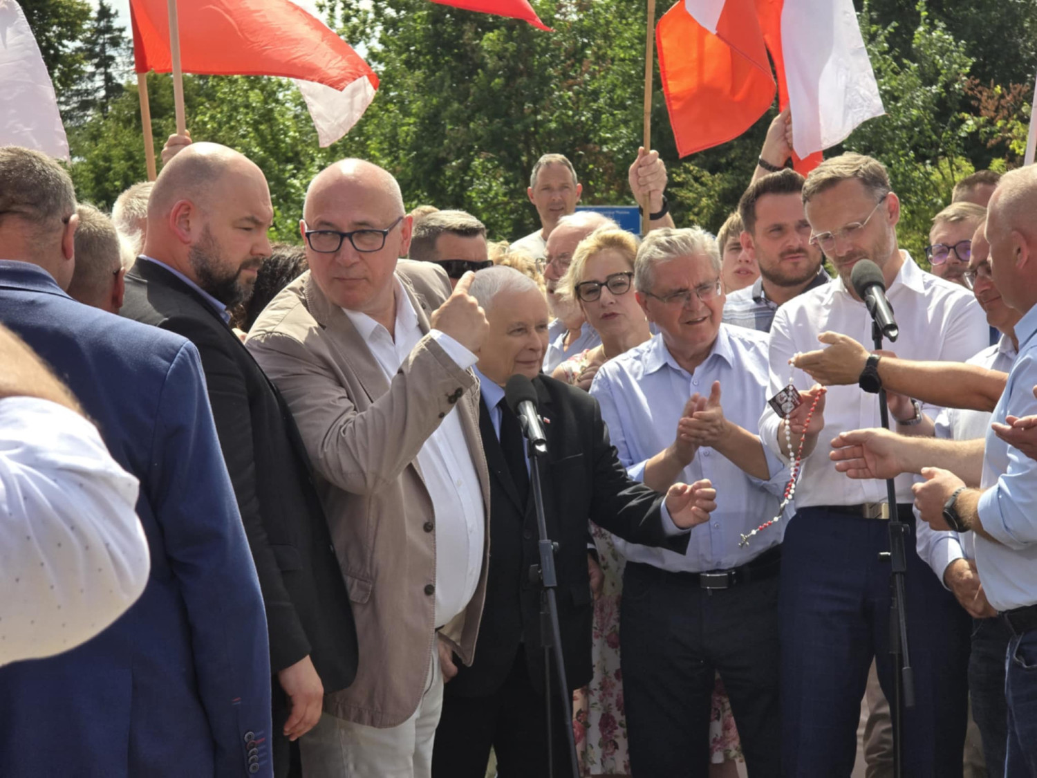 I dalej: – W sprawach fundamentalnych bardzo ważny jest głos społeczeństwa. My uzbieraliśmy pół miliona głosów z wnioskiem o referendum. Przyjdzie taki moment, gdy złożymy ten wniosek. Obywatele powinni się wypowiedzieć. Mamy plan, by przeciwstawić się niebezpieczeństwu – mówił prezes PiS. – Dziękuję tym, którzy własnym ciałem, własnymi rękoma i może przyjdzie czas, że coś w te ręce trzeba będzie wziąć, bronią granic. Oni udaremnili przerzuty migrantów i ujawnili to wielkie kłamstwo Tuska – kontynuował.