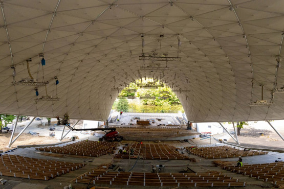 Nowe siedziska na widowni są osłonięte śnieżnobiałą konstrukcją dachu. Inaugurację przebudowanego Teatru Letniego zaplanowano na o...