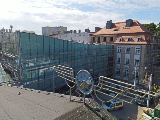 Na budowie Morskiego Centrum Nauki trwają przygotowania do montażu antracytowej siatki. Ma ona stłumić żywe barwy kolorowych płyt...