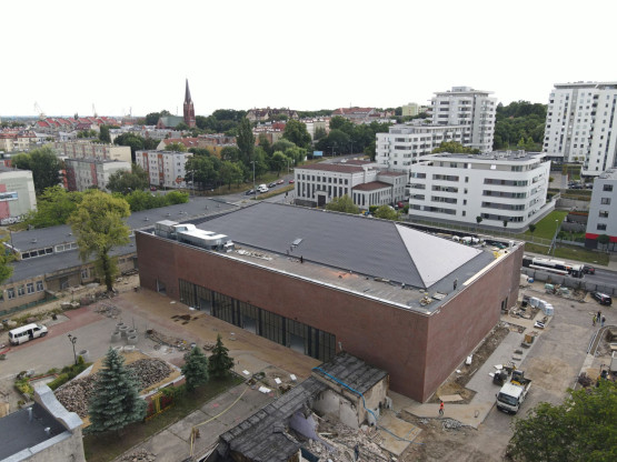 Trwa budowa nowoczesnej hali sportowej przy Zespole Szkół Elektryczno-Elektronicznych przy ul. Racibora w Szczecinie. Zewnętrzna e...