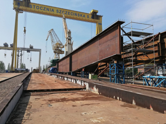 Na pochylni Wulkan w Stoczni Szczecińskiej scalane są elementy konstrukcyjne mostu drogowego, który połączy brzegi Regalicy w Podj...