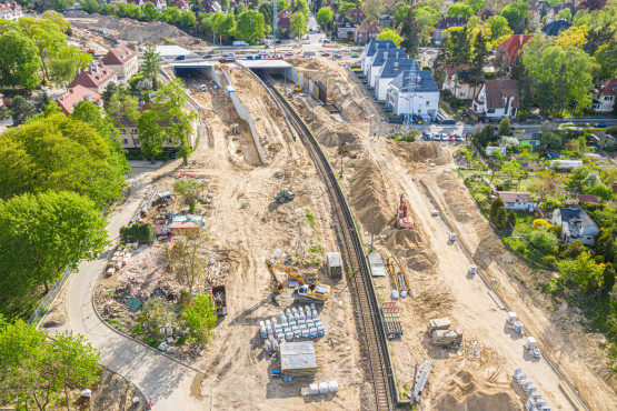 Przesunięcie linii kolejowej to jedno z założeń tej inwestycji. Przebieg prac budowlanych można zobaczyć na zdjęciach z drona udos...