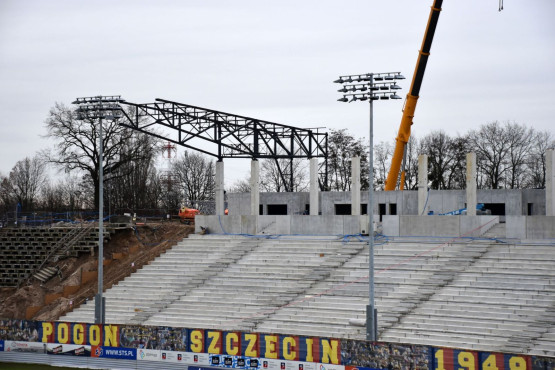 Na placu budowy stadionu miejskiego zamontowano pierwsze dźwigary dachowe. Każdy waży ok. 15 ton. Będzie ich 29.