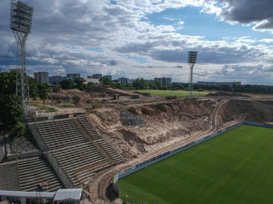 Zielony prostokąt murawy w połowie otoczony placem budowy. Tak obecnie prezentuje się szczeciński stadion z góry. Zdjęcia z drona...
