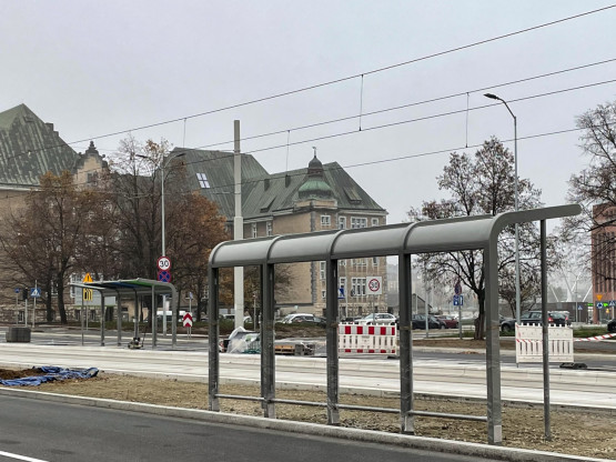 Na wysokości Przychodni Portowej widać już nowe wiaty przystanków tramwajowych oraz przejścia dla pieszych. To efekty poprawek pro...