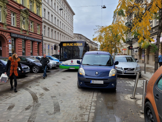 Auto na światłach awaryjnych blokowało przejazd na Jagiellońskiej. „Pasażerowie podpowiadali kierowcy, czy się zmieści”