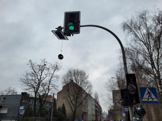 Uszkodzony sygnalizator wisi na kablu nad jezdnią. „Ktoś może mieć przez to zniszczony samochód” [foto]