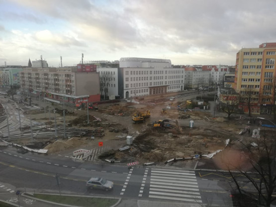Przebudowa infrastruktury torowej i drogowej na pl. Rodła trwa już od blisko 9 miesięcy. Na placu budowy gotowe są m.in. nowe wiat...