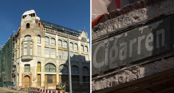 Niemieckie napisy na odsłoniętej elewacji Starej Drukarni. To ślady historii sprzed 120 lat