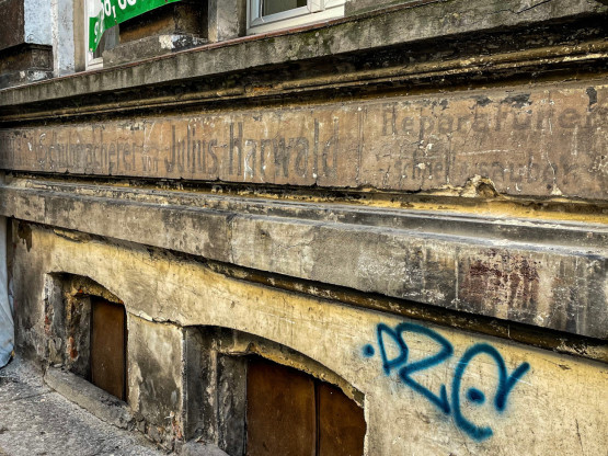 Pomimo tego, że jest wyblakły i brakuje pojedynczych liter, bez problemu można go odczytać. Mowa o przedwojennym szyldzie po dawny...