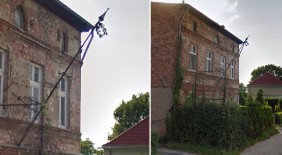 Maszt zwieńczony wieńcem laurowym i ozdobnym grotem był oryginalną częścią wyposażenia kamienicy przy ul. Marmurowej 16 w Podjucha...