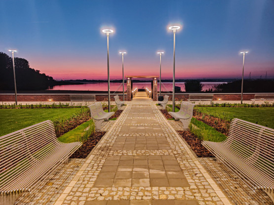 Leżaki, altany, stoły do gier, wielki statek dla najmłodszych, oświetlona alejka spacerowa i budynek administracyjno-socjalny. To...