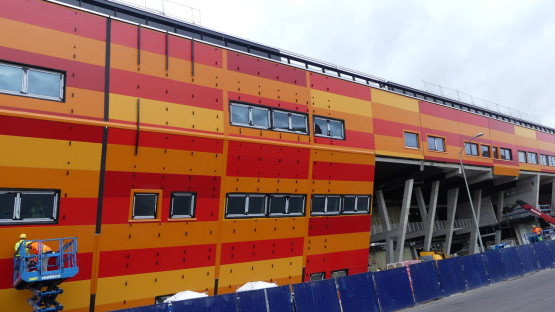 Na budowie Morskiego Centrum Nauki trwają przygotowania do montażu antracytowej siatki. Ma ona stłumić żywe barwy kolorowych płyt...