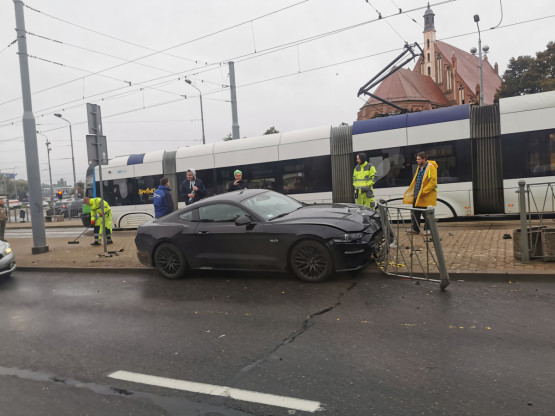 Samochód osobowy wypadł z jezdni i staranował barierki na przystanku tramwajowym.