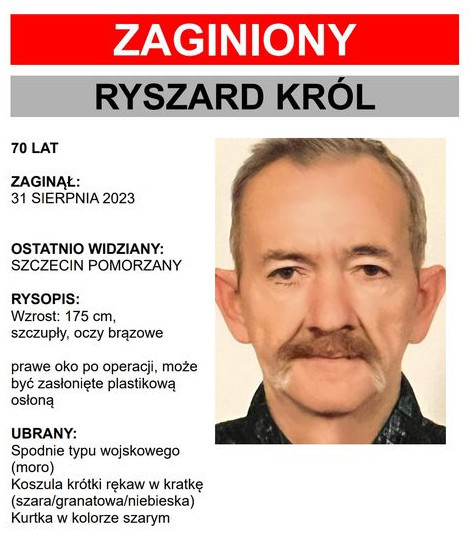 Trwają poszukiwania 70-letniego Ryszarda Króla. Mężczyzna jest szczupłej budowy ciała, ma charakterystyczne wąsy, około 175 cm wzr...