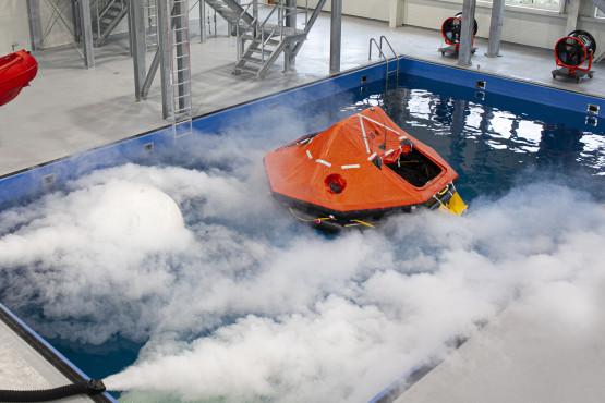 Głęboki basen z prawdziwymi elementami wyposażenia bezpieczeństwa i ewakuacji statków czy turbin wiatrowych oraz nowoczesne symula...
