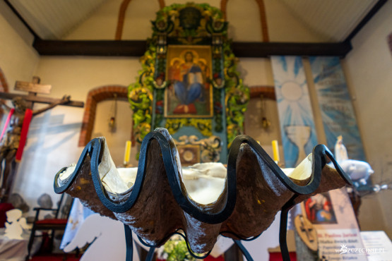 To najprawdopodobniej jedyna taka chrzcielnica w Polsce. Została wykonana z muszli przydaczni olbrzymiej – największego małża na ś...
