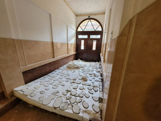 Całe ocieplenie sufitu runęło na klatkę schodową w centrum miasta. „Jakby ktoś tam przechodził, to byłaby tragedia”