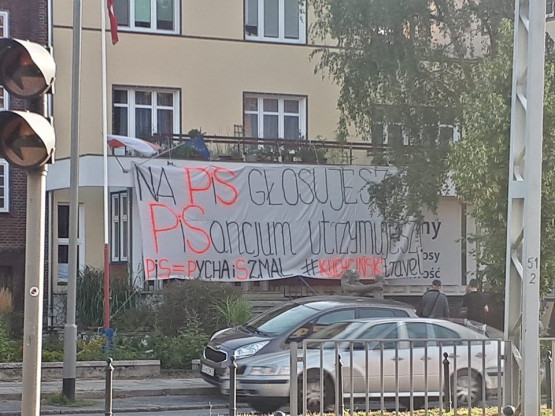 Komitet Obrony Demokracji w Szczecinie dzisiaj rano przed siedzibą Prawa i Sprawiedliwości wywiesił wielką płachtę, której hasła u...