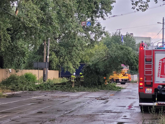 Powalone drzewo kompletnie zablokowało przejazd na wysokości ul. Stalmacha w Szczecinie. Strażacy pracują, by usunąć drzewo z jezd...