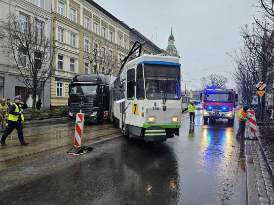 Zderzenie ciężarówki z tramwajem na Krzywoustego. Wagon wypadł z torowiska [foto]
