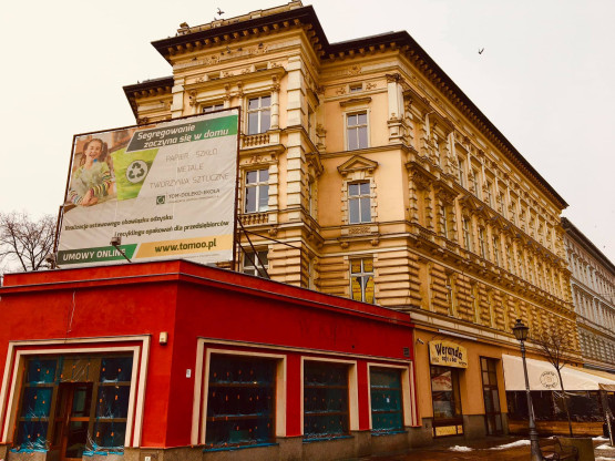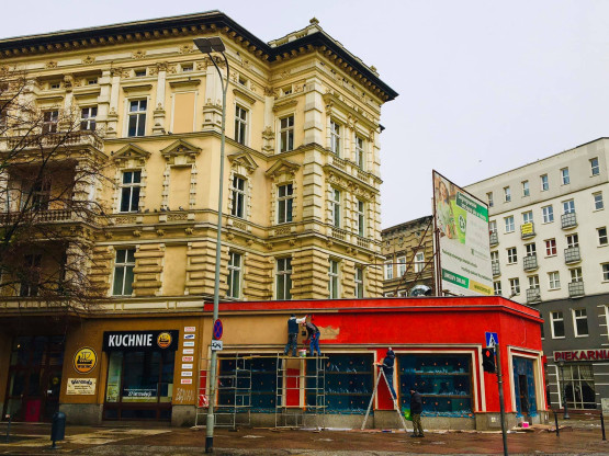 Krwistoczerwony pawilon przy żółtej, stonowanej elewacji kamienicy. „Czy w tym mieście, kogoś jeszcze obchodzi estetyka?”