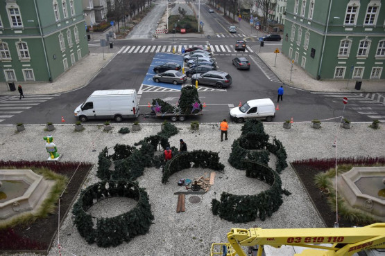 Ma 12 metrów wysokości i zawiśnie na niej ponad 10 tys. światełek. Przed gmachem Urzędu Miasta w Szczecinie trwa montaż bożonarodz...
