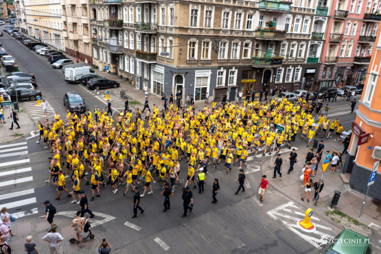 Blisko pół tysiąca sympatyków Broendby Kopenhaga wyruszyło po godzinie 15 z deptaku Bogusława w kierunku stadionu. Ich drużyna zmierzy się z Pogonią Szczecin w ramach 2. rundy eliminacji do Ligi Konferencji Europy. Początek meczu o godzinie 18.30.