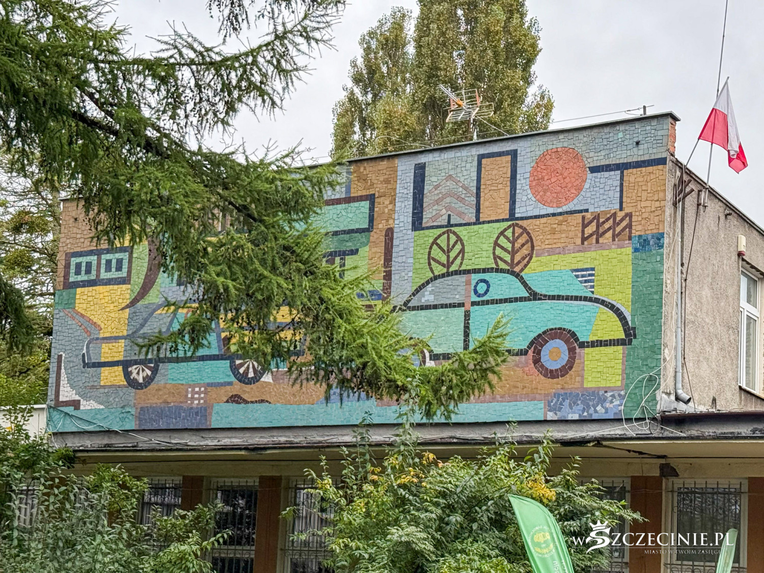 Na chwilę zatrzymujemy się przy wspomnianej już samochodówce – na jej elewacji można oglądać wielkoformatową mozaikę z dwoma samochodami wśród bloków i drzew.