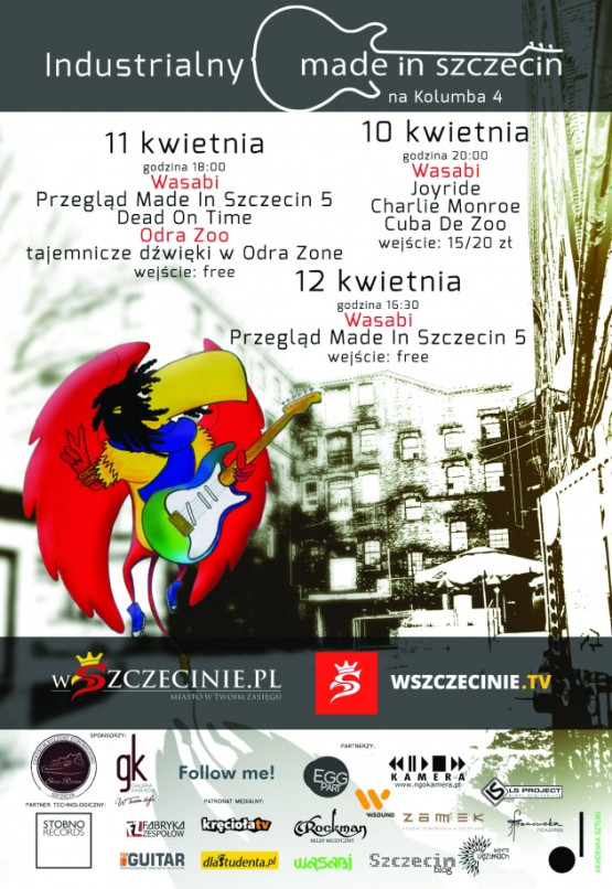 Organizatorzy artystycznego weekendu Industrialny Made In Szczecin zapowiadają na drugi weekend kwietnia wiele muzycznych (i nie tylko) atrakcji w większości za darmo. Już w piątek zagrają szczecińskie kapele: zwycięzcy Made In Szczecin 4 – Joyride (rock) i funkowo-rockowa grupa Charlie Monroe, która nie boi się psychodelicznych odjazdów. Wieczór zwieńczy popularna nie tylko w radiowej Trójce formacja Cuba De Zoo grająca melodyjnego rocka z polskimi tekstami. Wstęp na piątkowe koncerty wyniesie słuchaczy 15/20 zł.