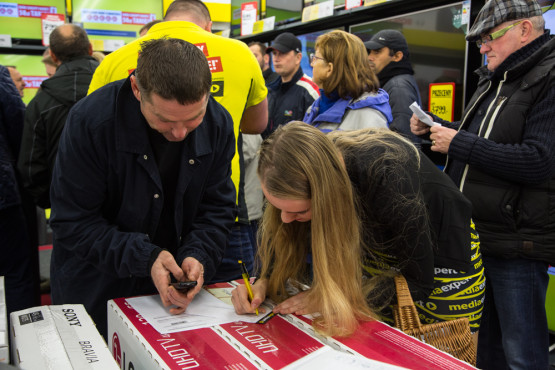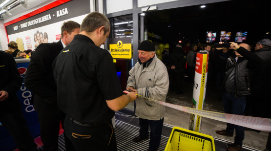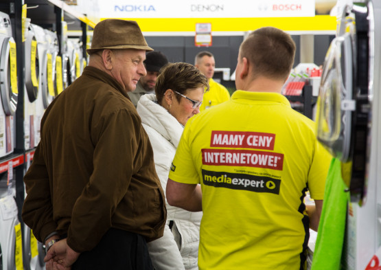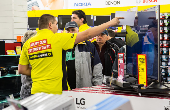 Pierwszym klientem nowego Media Expert był pan Wojciech. Przybył po wspomniany telewizor. Otwierał sklep wraz z kierownikiem i miał zaszczyt przeciąć wstęgę.