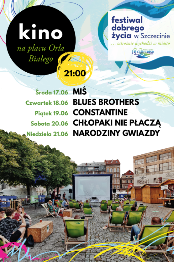 Jak informuje Małgorzata Miszczuk, rzeczniczka spółki Żegluga Szczecińska Turystyka Wydarzenia, seanse pod chmurką na pl. Orła Białego będą odbywać się od 17 do 21 czerwca, a następnie od 24 do 27 czerwca. Projekcje rozpoczynać się będą o godzinie 21.00. W repertuarze m.in. polskie komedie tj. „Poranek Kojota” czy „Chłopaki nie płaczą”. Wstęp jest bezpłatny.
