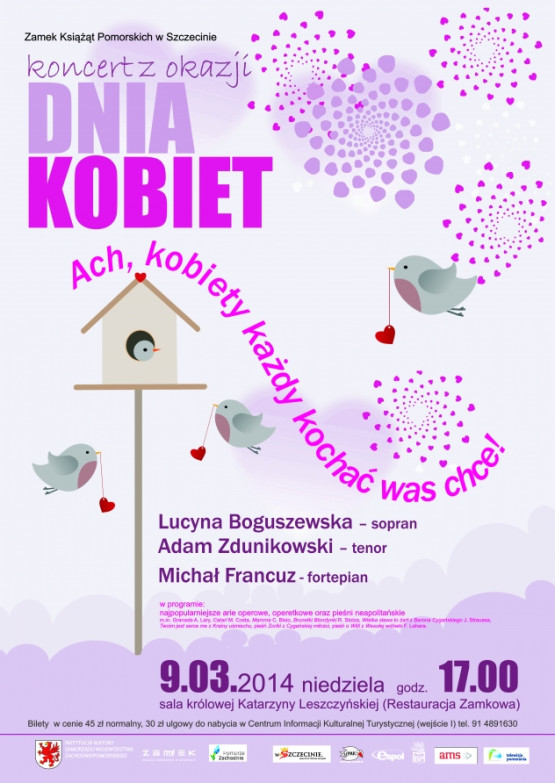 Koncert w wykonaniu Lucyny Boguszewskiej, solistki Opery na Zamku w Szczecinie oraz Adama Zdunikowskiego związanego z Operą Narodową w Warszawie został zatytułowany „Ach Kobiety, każdy kochać Was chce!”. Odbędzie się o godz. 17:00 w Sali królowej Katarzyny Leszczyńskiej (w Restauracji Zamkowej, wejście A, F).
