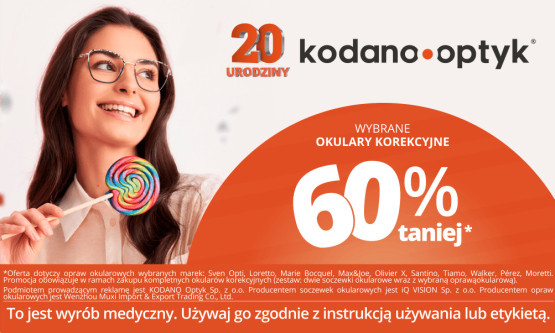 Tylko do końca czerwca w salonach KODANO Optyk można skorzystać z wyjątkowej promocji i wybrane okulary korekcyjne kupić aż 60% taniej! Przygotuj się na niezapomnianą modową przygodę! Sprawdź również pozostałe promocje, które dla Ciebie przygotowaliśmy!