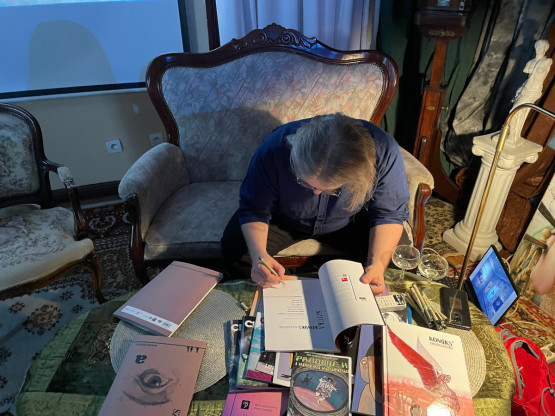– Dokładnie nie pamiętam, ale nie chodziłem jeszcze wtedy do szkoły. To była trzytomowa powieść o krasnoludkach, a dymki z tekstami pisał dla mnie brat – mówił podczas Tygodnia Sztuki Otwartej. Dodajmy, że spotkanie autorskie poprowadziła Kinga Rabińska, a Andrzej „Graba” Grabowiecki udostępnił przestrzeń swojej pracowni fotograficznej przy ul. Bałuki.