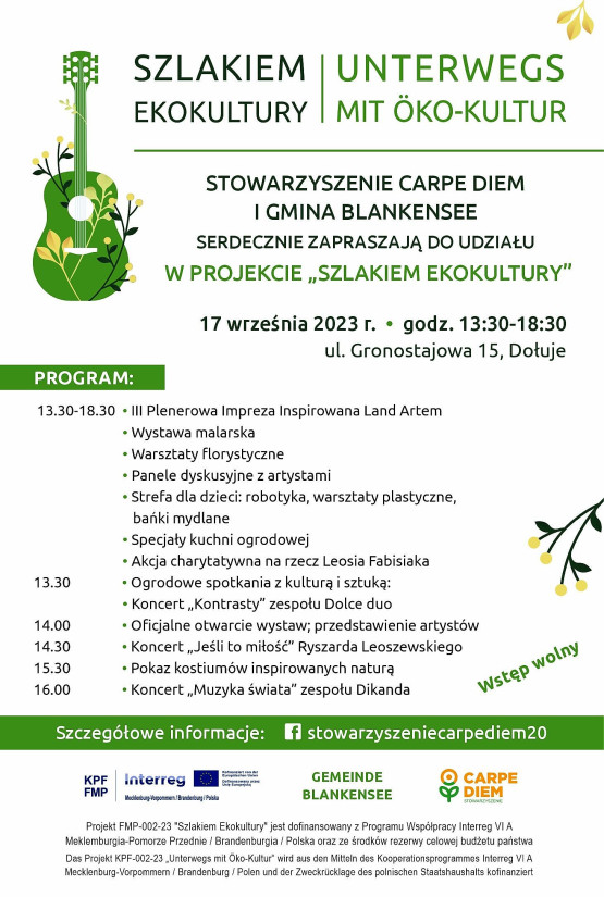 Projekt FMP-002-23 „Szlakiem Ekokultury” jest dofinansowany z Programu Współpracy Interreg VI A Meklemburgia-Pomorze Przednie / Brandenburgia / Polska oraz ze środków rezerwy celowej budżetu państwa.