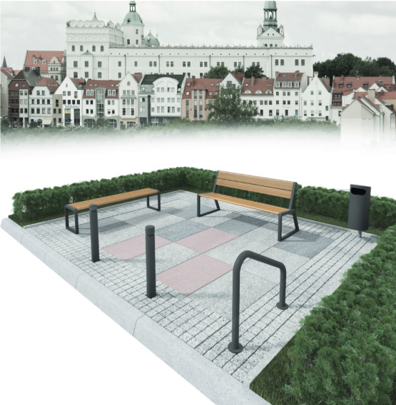 W katalogu mebli miejskich znajdziemy 8 różnych zestawów składających się z ławek, słupków, stojaków na rowery, śmietników i barierek. Zestawy przyporządkowane są do określonych stref, na które podzielono miasto. Bazowano przy tym na podziale administracyjnym Szczecina, ale w niektórych najbardziej zróżnicowanych osiedlach, teren podzielono na jeszcze mniejsze jednostki.