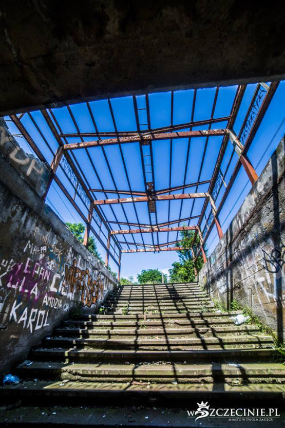 Zniszczona konstrukcja dachu przy schodach wejściowych na peron to obrazek przypominający krajobraz powojenny. Ponure wrażenie dopełniają walające się wszędzie śmieci i roślinność coraz śmielej wdzierającą się między ubytki w nawierzchni peronu.