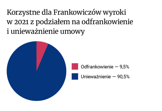 Z najnowszych statystyk wynika, że aż 96 procent spraw frankowych kończy się pozytywnym rozstrzygnięciem dla frankowicza. Zdecydowana większość (ponad 90%) skutkowała unieważnieniem umowy z bankiem.