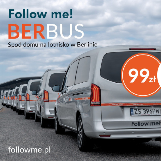 Transfery na lotnisko BER oferuje szczeciński przewoźnik Follow me! Dzięki usłudze BERBUS, na lotnisko w Berlinie można dojechać bezpośrednio spod domu.