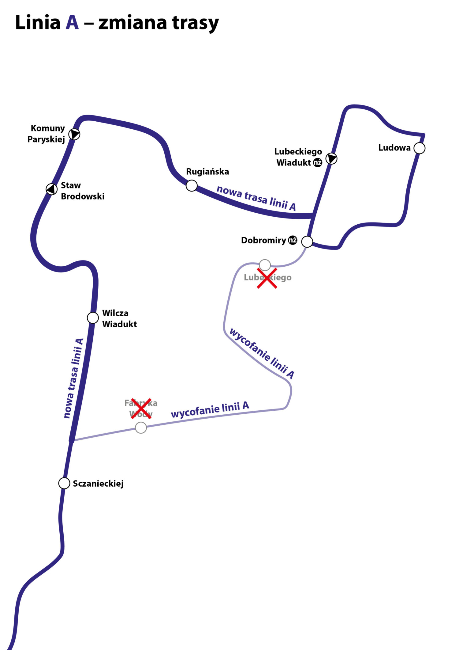 Trasa linii A zmieni się również na drugim końcu. Autobusy nadal będą dojeżdżać do pętli przy ul. Ludowej, ale inną drogą. Zamiast skręcać w ul. 1 Maja, pojadą prosto – Wilczą, a następnie skręcą w Komuny Paryskiej i Rugiańską do Ludowej.