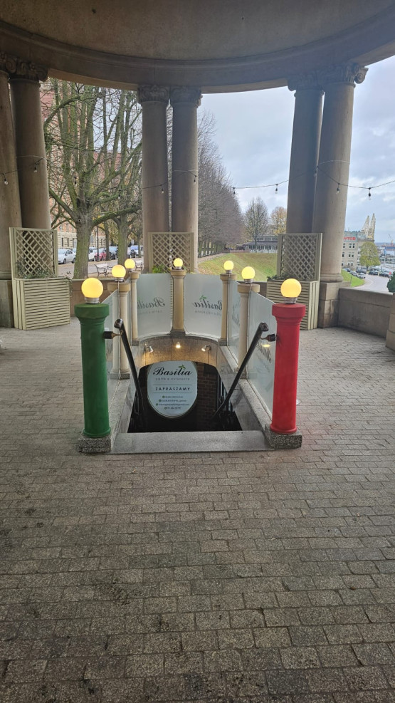 Basilia Ristorante zajmuje jedno z najbardziej reprezentacyjnych miejsc w Szczecinie. W rotundzie na Wałach Chrobrego, na wysokości ul. Szczerbcowej. Latem przyjemnie będzie usiąść przy stolikach z widokiem na Odrę, ale w sezonie jesienno-zimowym pozostaje dolny poziom. Trzeba zejść schodkami w dół, by zobaczyć przestronne wnętrza.