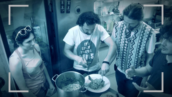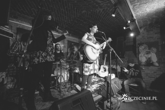 Piwnica teatru Kana. Na ścianach wystawa prac studentów Wyższej Szkoły Użytkowej. Cicha i spokojna muzyka "do pogadania".